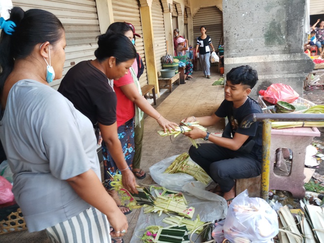 KLUNGKUNG – Ditengah hiruk pikuk keramaian pasar galiran bertepatan dengan hari penampahan Kuningan Jumat 17 Juni 2022 pagi ada yang menjadi pusat perhatian para pengunjung pasar Galiran Klungkung, yaitu adanya seorang pedagang canang pria yang asik jajakan dagangannya pada pembeli. Hal itu jelas menjadi perhatian pengunjung pasar karena dilihat kurang biasa yang berjualan ini seorang pria, malah seorang pemuda ganteng jebolan sebuah SMKN di Karangasem.