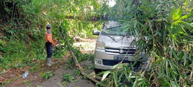Terlihat mobil APV yang tertimpa pohon tumbang di jalur Jalan Juuk Manis-Gelumpang, Kecamatan Karangasem, Senin(21/3/2022).