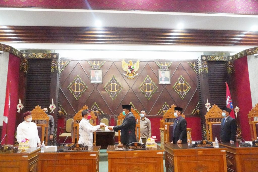 Ketua DPRD Karangasem I Wayan Suastika saat menyerahkan rekomendasi dan catatan strategis dewan terkait LKPJ…